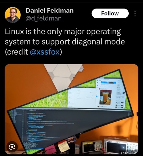 Twitter post by Daniel Feldman (@d_feldman): Linux is the only major operating system to support diagonal mode (credit [Twitter] @xssfox). Image shows an untrawide monitor rotated about 45 degrees, with a horizontal IDE window taking up a bottom triangle. A web browser and settings menu above it are organized creating a window shape almost like a stepped pyramid.