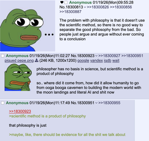 kali_fornication@lemmy.world to Greentext@sh.itjust.works · 14 hours agoAnon gets philosophicallemmy.worldimagemessage-square5linkfedilinkarrow-up184arrow-down12