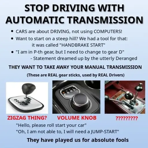 As a classically trained driver I’ve found automatics make people drive worse because they have to think less. And they already barely think.