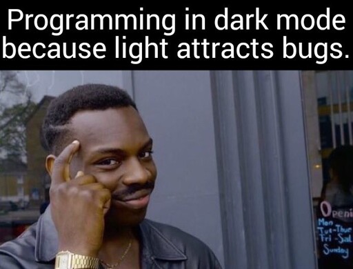 minus-squareCrackedLinuxISO@lemmy.dbzer0.comlinkfedilinkEnglisharrow-up1·9 days agoProblem is that if you use white text on dark background, the bugs will be attracted to your code. Meanwhile, when I use dark text on a white background, the bugs are only attracted to whitespace. Easily removed with a linter.
