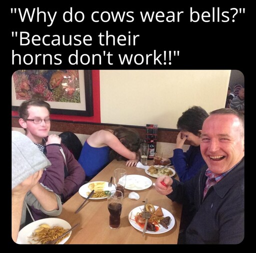 minus-squareminorkeys@lemmy.worldlinkfedilinkarrow-up3·5 hours agoEver notice how much women love pickup lines and that they’re all basically dad jokes?