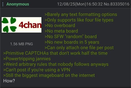 minus-squareSkullgrid@lemmy.worldlinkfedilinkarrow-up2arrow-down1·10 hours ago Lol “4chan is the biggest website out of all the websites identical to 4chan” Most imageboards and 2channel-style discussion boards allow (and encourage) anonymous posting and use a system of tripcodes instead of registration. https://en.wikipedia.org/wiki/Imageboard#Tripcodes I have used a variety of imageboards, and looked into their history. Instagram isn’t a fucking imageboard.